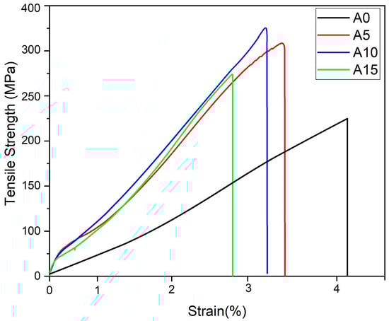 The tensile strength and elongation of Cr-reinforced AA5083 metal matrix composites were evaluated for varying Cr reinforcement ratios (0%, 5%, 10%, and 15% by weight), as illustrated in Figure 5. The results, which are also indicated in Table 2, reveal significant variations in tensile strength and elongation in correspondence with changes in Cr content. The unreinforced AA5083 sample exhibited the lowest tensile strength at 220 MPa. A remarkable 40% increase in tensile strength was observed in the A5 sample with 5% Cr reinforcement, reaching 304 MPa. This improvement is attributed to the uniform distribution of Cr particles within the matrix, which enhances the material’s load-carrying capacity. The tensile strength peaked at 324 MPa in the A10 sample, representing a 45% increase compared to the unreinforced material. This maximum strength is due to an optimal combination of Cr particle dispersion and interfacial bonding, which effectively transfers and distributes the applied stress. However, a decline in tensile strength was noted in the A15 sample despite its strength being higher than the unreinforced specimen. This reduction is attributed to the heterogeneous distribution of Cr particles at higher concentrations, which results in increased porosity [40,41]. Porosity introduces microstructural defects that compromise the mechanical integrity of the composite, counteracting the strengthening effect of Cr reinforcement. Conversely, elongation values decreased consistently with increasing Cr content. The unreinforced sample exhibited the highest elongation, reflecting its superior ductility. In contrast, the A5 and A10 samples showed significant reductions in elongation, with the lowest elongation being recorded in the A15 sample. This trend is due to the Cr particles restricting the free mobility of the aluminum matrix, thereby reducing the ductility of the composite [40,42]. Although Cr reinforcement enhances hardness, it also correlates with an increase in porosity. The elevated porosity in the A15 sample is a critical factor behind its reduced tensile strength relative to the A5 and A10 samples. These findings underscore the complex interplay between Cr reinforcement, porosity, and mechanical properties. Thus, the mechanical behavior of Cr-reinforced AA5083 composites is highly dependent on the reinforcement ratio. While moderate Cr reinforcement (5–10 wt.%) optimizes tensile strength, excessive Cr content (15 wt.%) leads to diminished performance due to microstructural inhomogeneities and increased porosity.