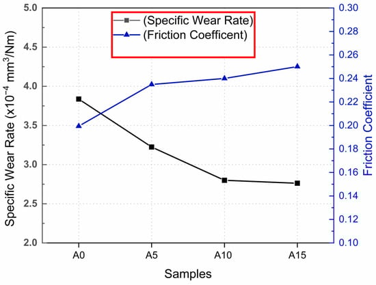 In the AA5083 composite, the reinforcement phase, which is firmly embedded in the matrix, is harder than the matrix phase. During the wear test, this phase cannot be suddenly detached from the surface, resulting in the formation of rough peaks, as illustrated in Figure 8. Additionally, the presence of Cr particles, which are harder and more rigid, makes them more difficult to abrade, contributing to an increase in the friction coefficient due to surface roughness. A combined examination of weight loss and friction coefficients confirms this mechanism. Despite the increase in the friction coefficient, a concomitant decrease in weight loss was observed, indicating that the Cr particles provided resistance to wear during the test and protected the matrix phase against the abrasive surface.