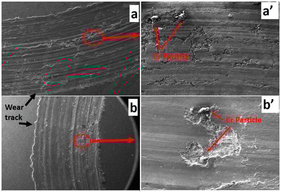 The specific wear rate and friction coefficient values of the tested samples are presented in Figure 6. The AA5083 matrix exhibited the highest wear loss among all tested materials, primarily due to its ductile nature. Being devoid of any reinforcement, the unmodified AA5083 matrix is more susceptible to deformation when subjected to the counter-abrasive ball during wear. The addition of Cr as a reinforcement significantly reduced the wear loss of the composites, with a continuous decrease being observed as the Cr particle concentration increased. For the A5 sample (5 wt.% Cr), wear loss was reduced by approximately 16% compared to the unreinforced AA5083 matrix. This reduction further improved in the A10 and A15 samples, with decreases of 25% and 30%, respectively. This enhanced wear resistance can be attributed to the Cr particles on the surface acting as barriers to abrasion, as illustrated in Figure 7a’,b’. When the abrasive ball moves across the composite surface, it must overcome the Cr particles before abrading the softer matrix phase [42,43,44,45]. Chromium (Cr) particles play a pivotal role in enhancing the wear resistance of AA5083/Cr composites. These particles form a robust barrier against abrasion, effectively shielding the softer aluminum matrix. Due to their high hardness and superior shear strength, Cr particles resist plastic deformation and prevent direct interaction between the abrasive counterbody and the matrix material. When subjected to wear, the Cr particles either endure abrasion or remain intact thanks to their strong adhesion to the matrix, which prevents detachment. Unlike ceramic-reinforced composites, where reinforcement particles often detach under stress, metal–metal composites benefit from excellent wetting and robust interfacial bonding, ensuring the retention of Cr particles during wear (Figure 8). This retention mechanism ensures that the abrasive ball interacts with the Cr particles, leveraging their hardness and high shear strength to minimize material loss [43]. The graphical representation of the friction coefficients reveals a positive correlation between the coefficient of friction and Cr concentration. Although this may initially seem counterintuitive alongside the observed reduction in wear loss, the explanation lies in the nature of the composite design. The increasing Cr content results in a harder surface, leading to greater frictional interactions during sliding [46]. However, this same hardness effectively prevents material removal, thereby reducing overall wear. In conclusion, Cr reinforcement enhances the wear resistance of AA5083 composites through the presence of hard, high-shear-strength Cr particles, robust interfacial bonding, and resistance to detachment [1,47]. While the coefficient of friction increases with higher Cr content, it does not compromise wear resistance, demonstrating the advantageous balance provided by the metal–metal composite design.