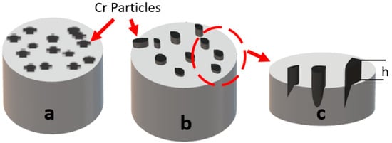 Over the years, aluminum Matrix Composites (AMCs) have garnered significant attention in the fields of engineering and technology due to their remarkable properties, such as being lightweight and high-strength, with exceptional wear resistance and excellent thermal conductivity [1,2,3,4,5]. These characteristics make AMCs highly suitable for a wide range of practical applications. For instance, AMCs are extensively used in the aerospace and automotive industries for components such as engine parts, brake rotors, and structural elements, where reduced weight and improved performance are critical. They are also employed in the electronics sector for heat sinks and packaging materials due to their excellent thermal conductivity. Additionally, AMCs have found applications in the defense and marine industries, where materials with high strength-to-weight ratios and corrosion resistance are vital [6,7]. AMCs are produced by combining the properties of a base alloy with the desired characteristics of reinforcement particles to create materials with enhanced performance. Among the numerous aluminum alloys available, AA5083 stands out as a highly suitable material for aerospace and automotive applications due to its exceptional properties, including its high strength, stiffness, and wear resistance [8,9,10]. Additionally, with a magnesium content of approximately 4%, AA5083 exhibits excellent corrosion resistance, making it an ideal choice for shipbuilding and pressure vessel applications [11,12]. Various types of particulate reinforcements, such as SiC, Al2O3, B4C, Gr, and TiB2, have been extensively studied and employed to improve the properties of AMCs [1,13,14,15]. However, the use of ceramic reinforcements introduces challenges, including poor wetting between the reinforcement and the matrix phase, resulting in weak interfacial bonding. This limitation hinders the material from achieving its desired strength and ductility [16,17,18]. Additionally, ceramic particles often agglomerate and detach from the matrix, further degrading the composite’s performance. These issues have limited the potential of ceramic-reinforced AMCs, prompting the exploration of alternative reinforcement strategies. One promising approach to overcoming these challenges is the development of metal–metal composites, where both the matrix and the reinforcement phases are metallic. Metal–metal composites offer strong interfacial bonding due to the formation of intermetallic compounds and other metallurgical reactions at the matrix-reinforcement interface. This strong bonding significantly enhances the mechanical and tribological properties of the composite. Materials such as Cu, Ni, Cr, and 316L stainless steel have been investigated as reinforcements in metal–metal composites [19,20]. Among these, chromium stands out for its ability to improve mechanical properties, corrosion resistance, and wear behavior. The influence of chromium extends beyond its ability to form carbides. When dissolved in the matrix, chromium enhances interfacial bonding through the formation of intermetallics, while undissolved chromium contributes to dispersion strengthening via chromium carbide formation [21,22]. The role of chromium in materials science is multifaceted and depends on its form and concentration. Within an optimal range, chromium carbides can enhance hardness and strength, contributing positively to the composite’s performance. However, excessive chromium carbide formation can lead to brittleness, compromising the material’s overall quality. Thus, determining the appropriate amount of chromium is crucial to achieving the desired properties for specific applications.