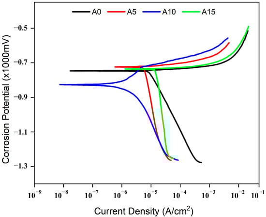 The potentiodynamic polarization curves of the composites and the AA5083 alloy are illustrated in Figure 9. The AA5083 alloy (represented by the black curve) serves as a reference, demonstrating the electrochemical behavior of the unmodified alloy. This curve reveals a specific corrosion potential (Ecorr) and current density (Icorr) which reflect the inherent corrosion rate and susceptibility of the alloy. When 10% chromium (Cr) is added to the AA5083 alloy (depicted by the blue curve), there is a significant shift in the corrosion potential to more negative values and a reduction in the current density compared to the base alloy. This shift may suggest a slightly increased tendency for corrosion initiation due to the presence of chromium [48]. The AA5083 alloy with 5% Cr (illustrated by the red curve) exhibits a corrosion potential similar to that of the unmodified AA5083 alloy but has a higher current density. The similarity in Ecorr indicates that the corrosion resistance is comparable to pure AA5083; however, the increased Icorr signifies a more aggressive corrosion process once it begins. The AA5083 alloy with 15% Cr (shown by the green curve) displays the highest current density among the samples, indicating a greater likelihood of corrosion initiation. Despite the elevated current density, it is not the highest density observed, suggesting complex corrosion behavior that might involve mechanisms beyond the mere presence of chromium [4,30].
