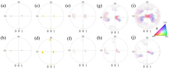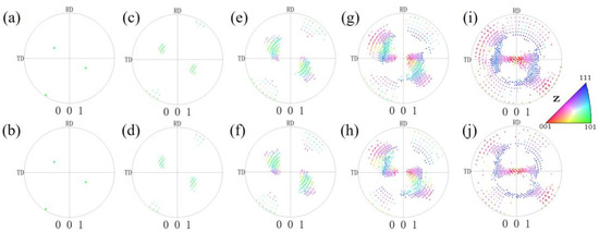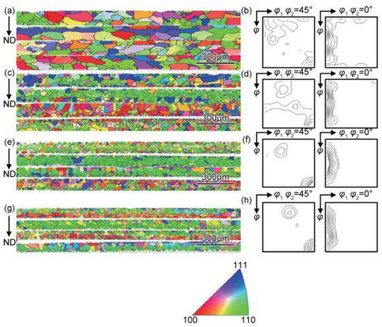 - Zhang, N.; Yang, P.; He, C.; Mao, W. Effect of {110}<229> and {110}<112> Grains on Texture Evolution during Cold Rolling and Annealing of Electrical Steel. ISIJ Int. 2016, 56, 146–1469. [Google Scholar] [CrossRef]