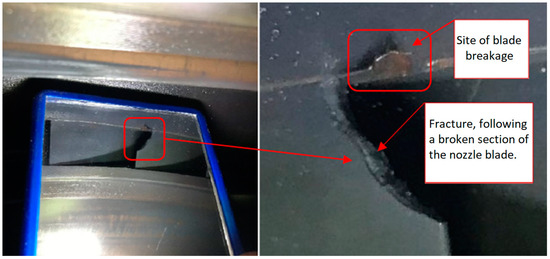 During turbine start-up, there is a rapid increase in the temperature and pressure, leading to the quick heating of the nozzle components, such as the blades and segments. This dynamic thermal process generates significant thermal stresses in the material, which can lead to deformations, delaminations, and local cracks. These stresses are particularly dangerous because, in areas of varying material thickness, uneven heating occurs, potentially leading to local overloads. In the long term, the thermal cycles associated with turbine start-up and shutdown cause material fatigue, increasing the risk of failure [11,12].