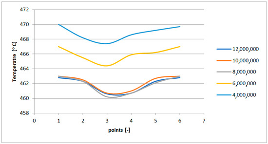 StE460 steel has the following strength properties: 460 MPa (yield strength, Re) and 560 MPa (ultimate tensile strength, Rm). Given that the material operates at high temperatures (510 °C), its properties will assume lower values. Due to the lack of literature sources addressing the relationship between Rm and Re as a function of temperature for StE460, values similar to those for Stg10t steel are used for the analysis [25]. Stg10t steel has very similar properties to StE460 steel, so this assumption is entirely valid. The strength limits for Stg10t steel are presented in Table 2.