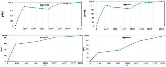 The stress graphs for the critical points in Segments 1′ and 2′ after the modifications clearly indicate that the stress values are now within the allowable limits. This demonstrates a marked improvement in the structural integrity and stability of the segments following the upgrade.