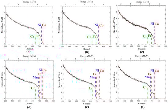 HIRBS spectra of: (a,d) unirradiated and irradiated by He2+ ions (40 keV) with fluences of (b,e) 5 × 1016 cm−2 and (c,f) 2 × 1017 cm−2, (a–c) CoCrFeNi and (d–f) CoCrFeMnNi HEAs.