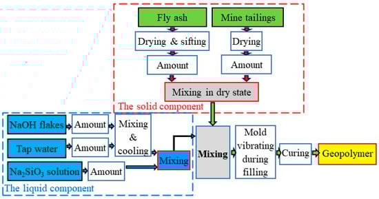 The procedure for obtaining the geopolymers consisted of the following steps: The raw materials (FA and MT) were dried, weighted, and mixed for 3 min (until a homogeneous mixture was obtained). Before mixing, the FA was dried, and only the particles lower than 100 µm in diameter were kept. During the process, sodium silicate and sodium hydroxide solution were mixed according to the composition. Afterwards, the liquid component (activator) was added over the solid component (raw materials) and mixed for 3 min to obtain a homogeneous mixture. The mixing of the components was conducted using a planetary mixer with variable speed, according to the EN 196-1:2016 standard [32]. A schematic representation of geopolymers obtained is presented in Figure 1. After mixing the liquid and the solid component, the obtained binder was poured into molds with sample dimensions of 40 mm × 40 mm × 160 mm, and their vibration was applied in order to obtain a uniform mixture with reduced air bubble content. The filled molds were then cured at room temperature (22 ± 2 °C) up to the testing age. For the first 24 h, the samples were covered with a plastic sheet in order to reduce the evaporation rate of the liquid, then kept in open air.