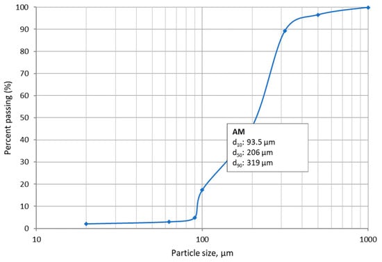 The particle size distribution of copper mine tailing was studied as received without additional grinding. The particles were finer than 1250 µm. The main part of the particles (89%) was below 315 µm; almost half of the total amount of particles (46%) was below 200 µm. The fraction of particles with a size favorable for geoplymerization (<100 µm) was 17%. The finest fraction (between 90 and 63 µm) was 3%. The average values of particle size were 320, 210 and 90 µm for d90, d50 and d10, respectively (Figure 2). The particle size distribution curve was very steep, indicating a uniformly graded material [33]. Generally, the particle size distribution of the studied copper-mine tailing (90% below 0.3 µm) showed a fine sized material suitable for the geopolymerization process, according to the criteria proposed by Aseniero et al. [34]. However, the finer particle size was proven to increase the reactivity and to improves the geopolymers characteristics [35]. In this study, a relatively low percentage of the particles of mine tailing (17%) was below 100 µm, and the dimension was characterized with higher reactivity; thus, additional activation or blending with reach of aluminosilicates raw materials with fine particles was needed to obtain geopolymers with desired characteristics.