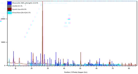 An important prerequisite for raw materials is a higher content of Al2O3 and SiO2, preferably in amorphous reactive form [12,37,42]. The mineralogical composition of the studied copper mine tailing is presented on Figure 3 and Table 5. The primary minerals are quartz (SiO2) 69.0%, clinochlore ((Mg, Fe2+)5Al2Si3O10(OH)8) 8.5%, zeolite (SiO2) 0.5% and muscovite (KAl2(AlSi3O10) 22.0%. Alumosilicate minerals presented in the sample and the zeolite phase could be expected to favor the geopolymerization process, resulting in geopolymers with a high compressive strength [12,42,43].