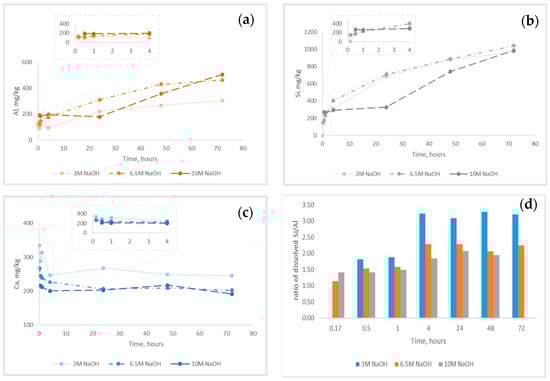 The alkaline reactivity of mine tailing was studied at different concentrations of alkali (3.0; 6.5 and 10 M NaOH). The level of dissolution of Ca, Al and Si in alkaline media was followed at different time intervals, starting from 10 min up to 72 h by the ICP-OES determination of the concentration of the studied components in the obtained solutions. The alkaline reactivity of studied mine tailing was estimated as mg dissolved component per kg solid sample. The results are presented in Figure 4a–c. The concentration ratio of dissolved Al to Si as a function of molarity of NaOH and time of leaching is presented on the Figure 4d.