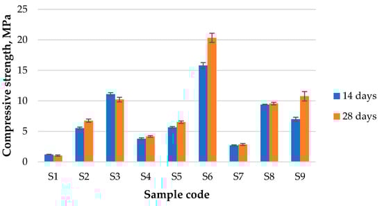 Compressive strength. Figure 5 shows the evolution of compressive strength from 14 to 28 days for the obtained geopolymers. As can be seen, the mixture specific to S1 did not perform too well at this test, being one of the samples with almost the same lost value at 28 days. In this case, S6 exhibited the optimum composition despite the aging time, while S1 and S3 showed a slight decrease after 28 days of curing. The increase in compressive strength was in the range of 22 to 54%; the highest evolution was presented by S9, while the lowest was shown by S8. Overall, it can be observed that the compressive strength depends on the raw material mixture and the Na:Al ratio; higher ratios result in better compressive strength. A replacement of FA with MT seems to promote the best compressive strength, despite the Na:Al ratio. A 25 wt.% replacement of FA with MT showed the optimum replacement, yet at 50 wt.% of MT, the compressive strength of the blended geopolymer is superior to that based on FA at almost all testing ages and Na:Al ratios. Moreover, all mixtures showed a low deviation value, which confirms that the obtained samples had a homogenous structure and composition.