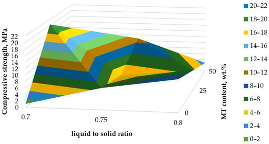 To better understand the influence of the obtained parameters on the mechanical properties of the obtained geopolymers, 3D plots were drawn. Figure 6 shows the influence of MT content and the liquid-to-solid ratio on the compressive strength. As can be seen, higher liquid content will result in poor mechanical properties. The optimum mixture is the one with 25 wt.% MT and a 0.7 liquid-to-solid ratio. This behavior could be related to activator loss during curing. The OH− from the activator, especially from the NaOH solution, is responsible for the leaching process of Si4+ and Al3+ ions; therefore, a loss of activator will also result in a loss of the necessary ions to assure the dissolution of the aluminosilicate material [45]. Moreover, during this drying stage, the water evacuation will also promote crack formation [46]. The samples with only FA as a precursor showed an increase in compressive strength with the increase in liquid-to-solid ratio, probably due to the nature of the FA particles sponge-like structure, which will absorb the activator and release it much slower compared to the compact particles from MT [47].