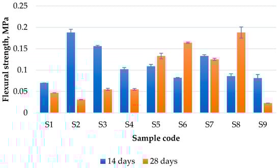 Flexural strength. The flexural strength of the obtained geopolymers decreased in most of the cases from 14 days to 28 days (Figure 8), except for samples S5, S6 and S8, where a significant improvement in flexural strength can be observed. For example, from 14 to 28 days, the value of S8 and S6 increased almost two times, and the lowest increase was that of S5, which is approximately 20% higher. As observed, all mixture with FA as raw materials showed a decrease in flexural strength, probably due to the high Ca content that will react faster than Al, while at latter stages, the Si will start reacting, resulting in a much more brittle structure [48]. On the contrary, most of the samples that have MT content showed an increase in flexural strength over time, probably due to a lower concentration of Ca from the system. Considering the Na:Al ratio, it can be seen that only the mixtures with a Na:Al of 0.5 showed a decrease in flexural strength over time. At 14 days, the optimum composition was that of S2, while at 28 days, S8 showed the highest value.