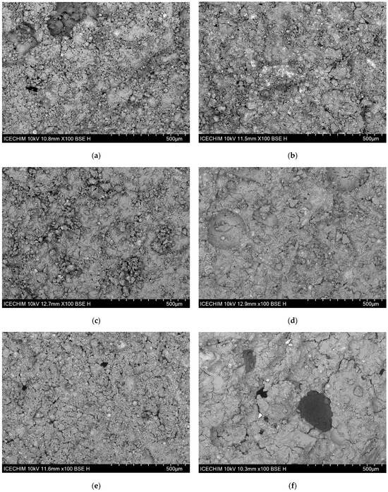 Microstructural analysis of the obtained geopolymers: (a) sample S1; (b) sample S3; (c) Sample S4; (d) sample S6; (e) sample S7; (f) sample S9.