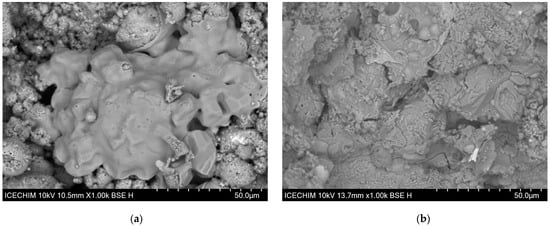 The microstructure of the obtained geopolymers at 1k× magnification: (a) sample S1; (b) sample S6.