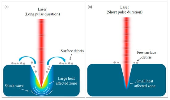 Illustration of laser–matter interaction characteristics: (a) long pulse and (b) short pulse(the gradient color represents the heat affected zones). (Adapted from [1] on the basis of open access).