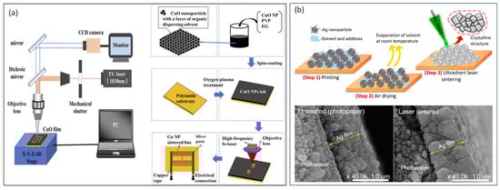 Electrical connection is created by femtosecond laser sintering of nanoparticles. (a) Femtosecond laser sintering copper nanoparticles (adapted from [63] on the basis of open access). (b) Schematic illustration of experimental strategy involving Ag NP printing; air drying at room temperature and femtosecond laser sintering steps; and the cross-section images of printed Ag NPs on photopaper, revealing the variations in film morphology before and after femtosecond laser sintering (adapted from [59] on the basis of open access).