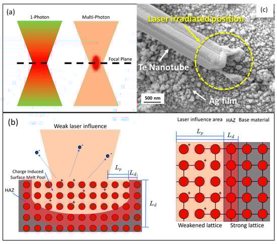 (a) Comparative illustration of single-photon and multi-photon absorption in femtosecond laser processes. (b) Demonstration of femtosecond influence on surface melting features. (c) SEM images of randomly distributed tellurium nanotube on printed silver film electrodes after femtosecond laser irradiation with 25 mW (adapted from [79] on the basis of open access).