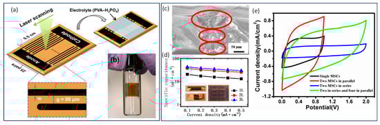 (a) Schematic of the micro-supercapacitor fabricated by laser carbonization. (b) Photographic image of a fabricated micro-supercapacitor attached to the curved wall of a vial (r = 7.5 mm). (Reprinted from [87], Copyright © 2014 Elsevier Ltd.) (c) Cross-section of the three-layer electrode. The circle stands for the carbonized area. (d) Specific capacitances of the MSCs calculated from the GCD curves as a function of the current density. Photos of the fabricated MSCs with different connections are inserted at the bottom. (e) GCD curves of MSCs with four kinds of connections at a current density of 0.1 mA/cm2. (Adapted from [90], Copyright © 2017 Elsevier Ltd.).