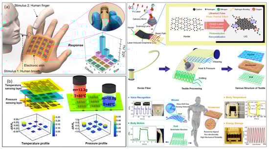 (a) Conceptual image of a flexible sensing matrix that conformably contacts with a human hand and provides viable responses to moisture stimuli, and the relative change in impedance (ΔZ/Z0) of each pixel in the matrix, demonstrating the mapping capability of the e-skin in the non-contact mode. (Reprinted from [118], Copyright © 2017, American Chemical Society). (b) A schematic of the sensor matrix prepared by the femtosecond laser-based micro-fabrication method, and the schematic illustrating the simultaneous mechanical and thermal measurements of the sensor matrix. (Reprinted from [92], Copyright © 2019 Elsevier Ltd.) (c) Schematic illustration of e-textile production enabled by one-step maskless patterning of LIG on woven, nonwoven, and knit textiles. Reprinted from [121], Copyright © 2023, American Chemical Society.