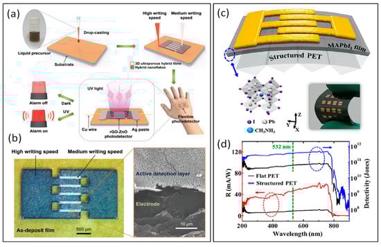 (a) Schematic illustration of the preparation of all rGO–ZnO hybrid-based photodetectors through a single-step FsLDW process by selecting a suitable writing speed for respectively patterning the interdigitated electrodes and the active detection layer. (b) In an optical image of the as-written interdigitated photodetector, an enlarged SEM image indicates the active detection layer and the electrode (Reprinted with permission from [132] on the basis of open access). (c) Schematic device structure of the perovskite FPD. The top-down materials are gold electrodes, MAPbI3 film, and structured PET substrate. The insets are the 3D schematic representation of MAPbI3 (left) and the optical image of the flexible device (right). (d) Comparison of photoresponsivity (R) and detectivity in the UV−NIR region. (Reprinted with permission from [133], Copyright © 2020, American Chemical Society).