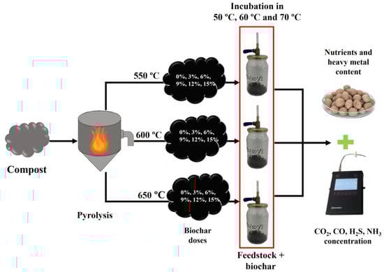 - Li, Y.; Kumar Awasthi, M.; Sindhu, R.; Binod, P.; Zhang, Z.; Taherzadeh, M.J. Biochar Preparation and Evaluation of Its Effect in Composting Mechanism: A Review. Bioresour. Technol. 2023, 384, 129329. [Google Scholar] [CrossRef] [PubMed]