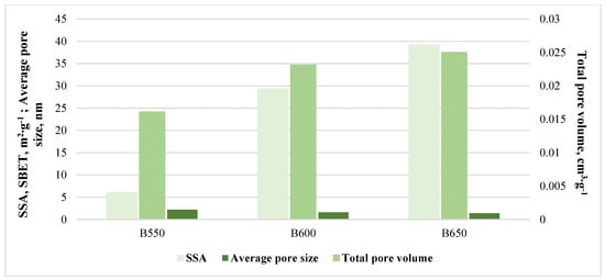 The important parameter in the assessment of biochars’ absorption properties is their specific surface area (SSA). In the present study, values of SSA (Figure 2) sharply increased along with the temperature of pyrolysis, from 6.06 (B550) to 39.2 m2∙g–1 (B650). Kumar et al. [16] showed that, in general, municipal solid biochars and livestock manure biochars have a lower SSA and porosity than plant biochars, e.g., the authors of [42] observed an increase in SSA parameters for bamboo biochars to 181.05 m2∙g–1 at 600 °C, in comparison to chicken manure biochars—11.84 m2∙g–1 at 500 °C [37].
