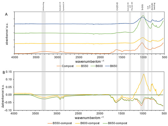 FTIR results of compost and compost biochars; (A) shows the FTIR spectra of compost and compost biochars (B550, B600, B650), and (B) shows the subtraction spectra of samples. The line indicates zero absorbance change for each subtraction spectrum.