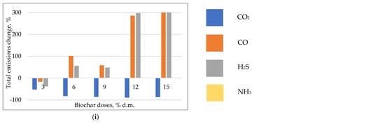 - The effect for CO, H2S, and NH3 mitigation was unclear; surprisingly, the reduction in CO emissions was observed at a temperature of 50 °C, with 30–60% effectiveness for B550, and 20–30% for B600; however, at 70 °C, an increase of >300% in CO emissions was observed; for H2S, the most effective was incubation at 50 °C–a reduction > 50%, with no positive effect for 60 and 70 °C.