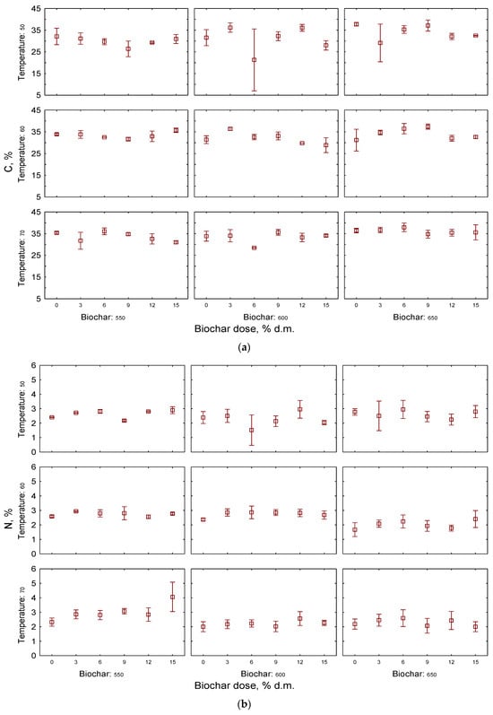 The elemental composition of the compost was evaluated by determining the content of C, H, N, and S in the biochar-amended feedstock after 10 days of incubation. In the case of carbon content in the post-incubated feedstock (Figure 5), the highest amounts were observed for samples with the addition of biochars produced at the temperature of 650 °C. It is widely documented that the pyrolysis temperature is crucial for the carbonization rate of biochar. High-temperature biochars are characterized by a polymerized, aromatic structure [35,77], which results in increased carbon content and was confirmed in our study. Although the effect of the condition of pyrolysis on compost biochars’ C content is clear, the dose of biochar did not have a significant effect on the C content in feedstock among the tested treatments, since for most doses the differences in C content were insignificant, reaching very similar values (no significant statistical change was observed). The mixing of stable, well-carbonized biochar with easily decomposable compost has been suggested as a solution for the enhancement of process performance and prevention of carbon losses [78]. For example, Gao et al., who tested the effect of co-composting with 300–400 °C biochar, noted that the amendment significantly increased the C content of composted material, which rose to 32.0% from 24.8% [79]. In the research of Darby et al., the addition of biochar produced at 600 °C increased the C content of the co-composted material from 28.2% to 35.1% [38]. However, in our study, the significant effect of biochar on C content in composted feedstock was not confirmed, which may be an effect of the relatively short time of the experiment. Nevertheless, the results of C content stay in line with CO2 emissions, as the highest carbon content was noted in treatments with lowest carbon dioxide emissions—incubated at 70 °C and amended with B650. It is noteworthy that the C content measured in our experiments is similar to findings of the aforementioned authors, reaching 35–40%.