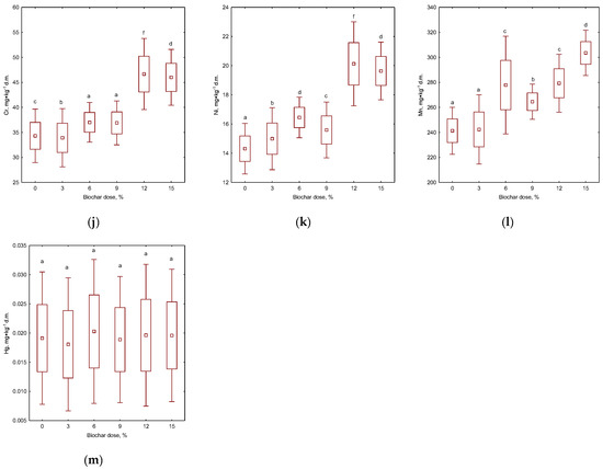 Effect of compost biochars’ addition dose for nutrients and heavy metal content in substrate after 10 days of composting (a) calcium (Ca), (b) magnesium (Mg), (c) potassium (K), (d) phosphorus (P), (e) sodium (Na), (f) zinc (Zn), (g) lead (Pb), (h) cadmium (Cd), (i) copper (Cu), (j) chrome (Cr), (k) nickel (Ni), (l) manganese (Mn), and (m) mercury (Hg). Letters (a, b, c, d, e, f) indicate the homogeneity group according to Tukey’s test at significance level p < 0.05.