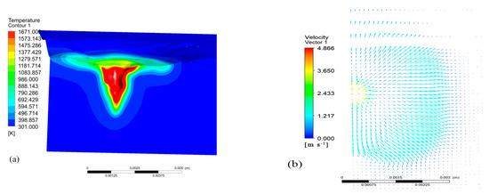 The morphology of the power of 2500 W and the surface flow velocity vector distribution with a scanning speed of 10 mm/s are shown in Figure 3a. The temperature range was 301–1671 K, which corresponded to the room temperature and the melting temperature of the metal substrate. The molten pool was concave, resembling a spoon with a wide top and narrow bottom. The material was rapidly vaporized by the laser, producing a pressure that emitted the molten metal and formed a spoon-shaped hole. The laser melted and evaporated the surface of the material. If the evaporation speed is large enough, the steam recoil pressure can overcome the tension of the liquid metal surface and liquid gravity, causing the molten pool in the liquid metal at the laser zone to become concave and form a small pit. The beam acted directly at the bottom of the pit, causing the metal to melt and gasify further. The high-pressure vapor then forced the liquid metal around the molten pool, deepening the hole. This process continued until a hole was formed in the liquid metal. The temperature at the center of the molten pool was the highest, and it spread to all sides. When the metal vapor pressure generated by the laser beam in the hole reached equilibrium with the surface tension and gravity of the liquid metal, a stable hole was formed without further deepening. The maximum flow rate was observed at the center of the molten pool due to the combined action of the recoil pressure and surface tension, gradually decreasing towards the periphery. When the flow rate of the molten pool decreased to a certain extent, the liquid metal moved from the center of the laser beam to the periphery of the molten pool due to the negative temperature coefficient of the surface tension. As a result, the flow rate of the molten pool rose again, exhibiting a wave-like pattern.