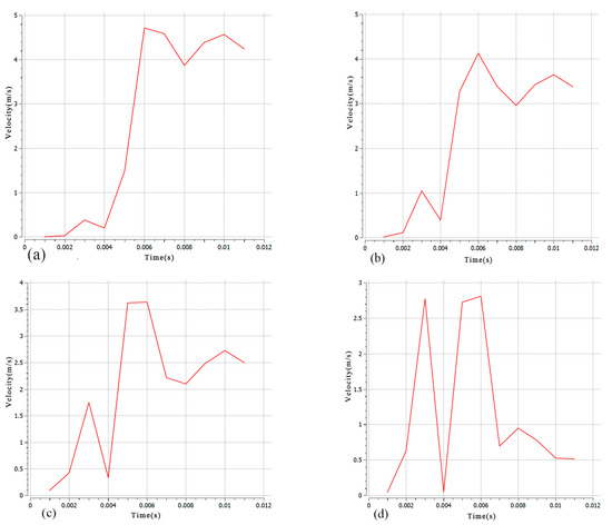 In order to study the flow field distribution within the steady-state melting tank, this simulation observed the symmetrical cross-section of the molten pool. Monitoring points A, B, C, and D were selected at different depths of the molten pool, and the velocity change curve over time is shown in Figure 4. It is evident that the molten pool had a flow rate of 0 before t = 0.001 s, indicating its initial formation at this time. The flow rate of the molten pool increased over time and reached its peak at t = 0.006 s. Subsequently, the monitoring point gradually decreased, with a faster decline rate closer to the bottom of the molten pool. The laser’s rapid heating caused a decrease in the molten pool temperature gradient and the liquid surface tension, resulting in a sudden decrease in the flow rate of the detection point at t = 0.003 s. The decrease was closer to the bottom of the molten pool. The maximum flow rate decreased as the molten pool depth increased. This was due to the greater friction force between the unmelted substrate and the molten pool fluid, which hindered the liquid flow as the pool approached the bottom. The flow rate in the upper part of the molten pool exceeded both the recoil pressure and the surface tension.