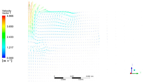 A plane perpendicular to the laser scanning direction was inserted at the center of the molten pool, and its flow rate distribution vector is shown in Figure 6. On the far-left-hand side of the vector distribution map, there is a symmetric line on the symmetry surface. This line reflects the flow rate distribution at the center of the molten pool. The molten pool had vortices of varying sizes distributed along the symmetry line. The flow rate of the molten pool corresponded to the distribution of the molten pool flow field in different cross-sections. This distribution was affected by the large surface tension and recoil pressure, causing the vortex at the bottom and closer to the center of the pool to have a greater flow rate. Technical terms are explained when first used.