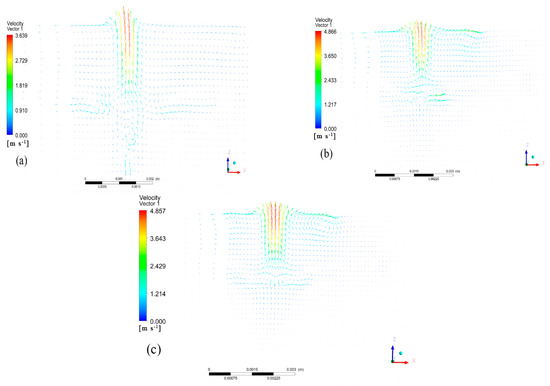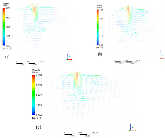 Vector maps of fluid velocity on the symmetry plane of molten pool under different scanning speeds: (a) v = 0.005 m/s, (b) v = 0.01 m/s, (c) v = 0.015 m/s.