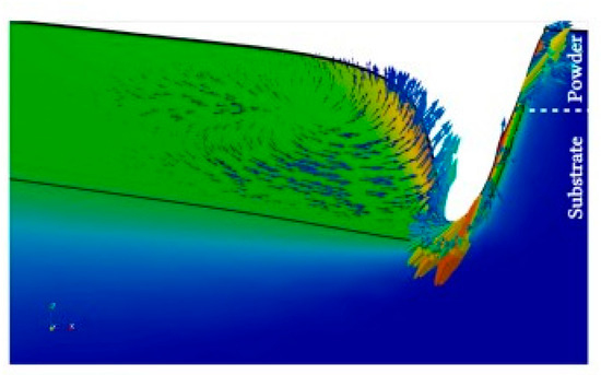 Grange et al. [21] established a three-dimensional finite element model of Inconel 738 laser coating that considered the temperature, stress, and flow fields. The molten pool flow vector map at the interface was plotted, as shown in Figure 9. The molten pool had a wide keyhole shape at the top and narrowed at the bottom, and the maximum flow rate of the molten pool was at the top, and the flow rate decreased as the depth decreased. Compared to the simulation results presented here, the distribution of the fluid vectors in the molten pool was in agreement.