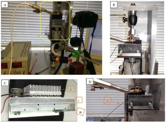 (A) Testing setup. (B) Testing block attached to L-shaped block holder which is kept in place in testing machine by means of electromagnet. Handpiece with tested file is mounted. (C) Peltier element (I) attached to L-shaped holder (II) and testing block (III) is fixed in place with a screw. (D) Thermometer metal probe (i) placed in a hole drilled in the testing block to measure core temperature of the block.