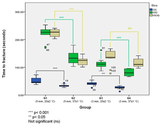 Mean time to fracture by groups. Group 1 (G1): 5 mm 20 ± 2 °C, Group 2 (G2): 5 mm 37 ± 1 °C, Group 3 (G3): 3 mm 20 ± 2 °C, Group 4 (G4): 3 mm 37 ± 1 °C.