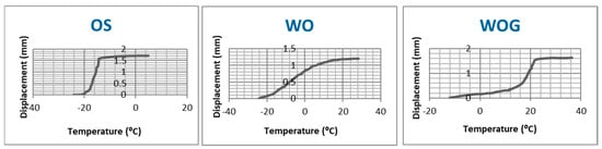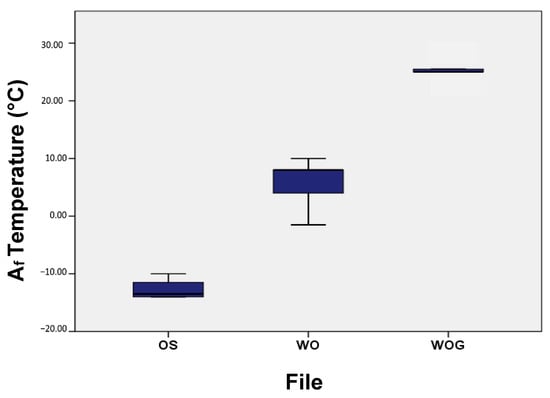 Table 2 shows the mean and standard deviation of active austenite start (As) and active austenite finish (Af) temperatures as determined by the bend and free recovery test. WOG showed the highest As and Af temperatures, while OS showed the lowest (Figure 5). All tested samples had an Af temperature below body temperature (37 ± 1 °C) (Figure 6).