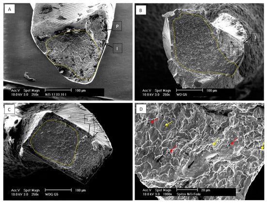 Analysis of the cross-section of fractured surfaces using scanning electron microscopy (XL30 SEM, Philips, Eindhoven, The Netherlands) showed characteristic fatigue fracture patterns. As shown in Figure 7, areas of crack initiation (I), crack propagation (P) and areas of catastrophic fracture with ductile failure (dotted line) that showed prominent dimple defects are identifiable. Micro-voids (Figure 7 red arrows) and inclusions (cones) (Figure 7 yellow arrows) of different shapes and sizes were also observed distributed among the fracture surface with higher magnification. Fatigue striations (black arrows) could also be detected at higher magnification.