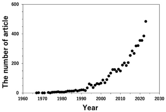The change in the number of articles in the fields of “Materials Science”, “Physics and Astronomy”, “Chemistry”, and “Engineering”, which include “quantitative analysis”, and “transmission electron microscopy” or “TEM”, in the title or abstract, or keywords. Data are referred to by scopus.com (accessed on 12 September 2023).