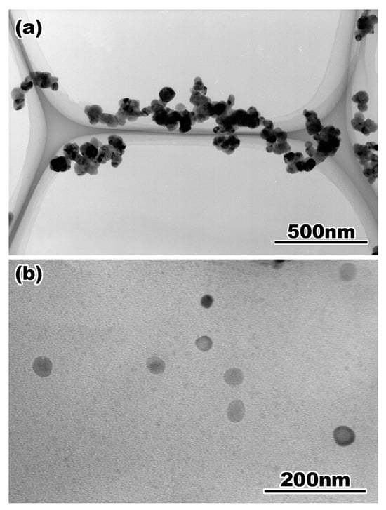 Figure 2a,b show TEM bright-field images of the ZrO2 nanoparticles prepared by the (a) common method and (b) ion milling method for cross-sectional observation. In the conventional method, a mixture of ZrO2 powder and ethanol is added to a TEM grid. The proposed method is simple and easy to implement; however, because of particle aggregation, the particles overlap with each other, as shown in Figure 2a, and it is difficult to observe the isolated particles. For the cross-sectional observation, particles dispersed ultrasonically are mixed with the epoxy resin and prepared by the standard method of mechanical grinding, dimpling, and ion milling. For the particle–resin mixture, the ZrO2 particles in the TEM specimen are smaller; however, they can be observed individually, as shown in Figure 2b.