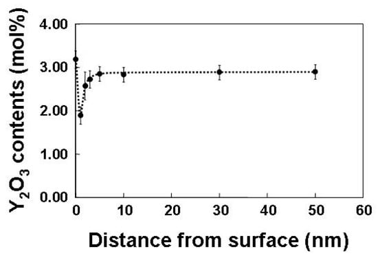 Figure 4 shows the Y2O3 distribution in a single particle, which is quantitatively analyzed using a point analysis. This figure presents the surface segregation of Y2O3. The Y2O3 content decreases steeply to a few nanometers from the surface, and the contents are recovered up to a nominal composition of approximately 3 mol% within less than 10 nm from the surface, and they remain inside the particles. This chemical inhomogeneity remains as grain boundary segregation after sintering [52], and it plays an important role in the phase transformation in the ZrO2-Y2O3 system. In these ZrO2 particles, a monoclinic region is observed near the surface, in which both phases exhibit a specific orientation relationship. The occurrence of the monoclinic phase is attributed to the stress-induced transformation during sample preparation [53,54,55,56,57,58]. In this study, a quantitative analysis is performed on the composition distribution of the nanoparticle surface segregation.