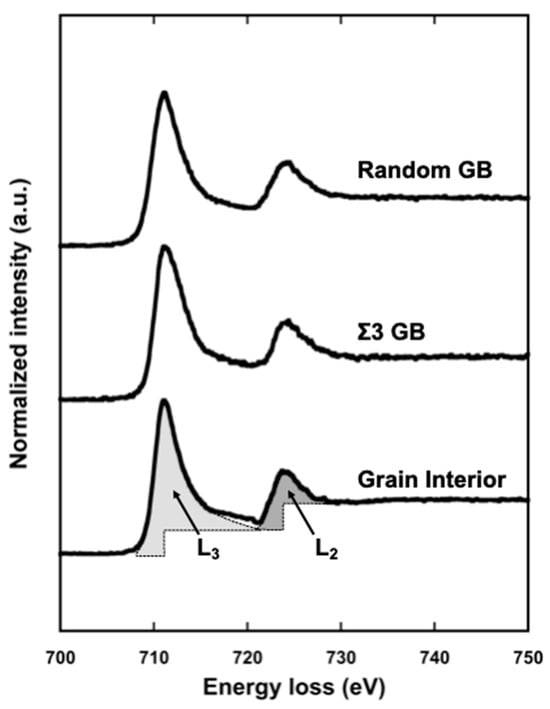 Typical L edge in EELS spectra obtained from grain interior (bottom), Σ3 grain boundary (middle), and random grain boundary (top) in iron, respectively. The L2 and L3 absorption edges are clearly seen at 710 eV and 725 eV, respectively. Each hatched region shown in the L2 and L3 edge represents schematically the line intensity in L edge obtained from grain interior, which is used in calculating the white-line ratio, R. Reprinted from Ref. [67] with permission from Elsevier.