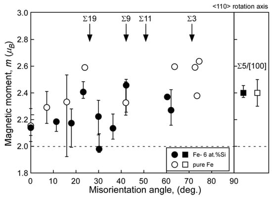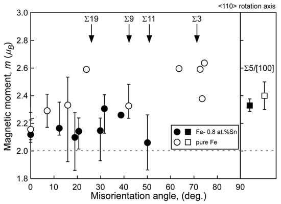 Figure 7 and Figure 8 show the misorientation-angle dependence of the local magnetic moment obtained in Fe-6 at% Si and Fe-0.8 at% Sn alloys [69]. Both figures include the magnetic moment at the grain boundary obtained for pure Fe as a reference [67]. The local grain boundary moment at the random boundary in the Fe–Si and Fe–Sn alloys was reduced compared to that in pure Fe. However, there is no remarkable change at the Σ5 boundary. These results suggest that the local magnetic moment is determined by combining the physical effect of the geometry and the chemical effect of segregation, as illustrated in Figure 9.