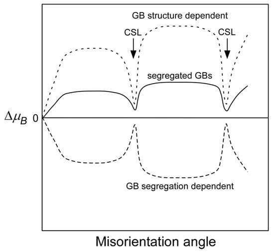 Schematic explanation of the misorientation dependence of the local magnetic moments at solute (impurity)-segregated grain boundaries, which will be determined by competing between the favoring effect due to the GB structure and disfavoring effect due to grain boundary segregation on the local magnetic moments. Reprinted from Ref. [69] with permission from the Japan Institute of Metals and Materials.
