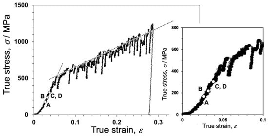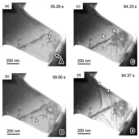 Figure 10 shows the true stress–true strain (S-S) curve of a 4N Al bicrystal pillar, including a single Σ3 grain boundary, obtained by in situ indentation experiments. The S–S curve exhibits an apparent yield phenomenon around the crossing point of the two dashed lines drawn in the S–S curve, and after yielding, a small stress drop is frequently detected. This phenomenon is known as intermittent plasticity [156,179]. Figure 11 shows snapshots captured in the movie during in situ straining for the Σ3 bicrystal pillar. This movie is available as a supplementary movie in Ref. [173]. Figure 11a,d correspond to A to D in Figure 10, respectively. The dislocations were activated and transferred across the grain boundaries before the macroscopic yield phenomenon. The critical resolved shear stress (CRSS) that the dislocation is transferred across the grain boundary was measured from the S–S curve in Figure 10 within 0.06–0.09 GPa. This CRSS matches the stress range estimated from the Hall–Petch coefficient obtained from the macroscopic experiments [180,181].