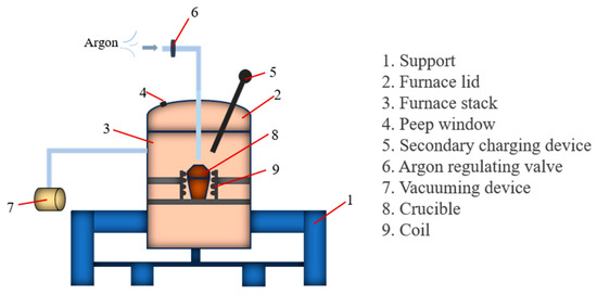 The experimental U75V steel was smelted in a ZG-0.02 20 Kg vacuum induction furnace; the structure diagram is shown in Figure 1, and the raw material composition of the experimental steel is shown in Table 1. The smelting steps of the experimental steel are as follows: (1) The iron rod required for smelting the test steel is placed into the crucible, and the rare earth Ce, ferrosilicon, ferromanganese and ferrovanadium alloys are placed into the secondary charging device. (2) In order to eliminate the impact of impurities in the air, the vacuum furnace is vacuumed first and then filled with high purity argon. (3) After aeration, heating is carried out; the initial power is 5 Kw and then increased at a rate of 3 Kw/20 min until the iron rod is completely melted. (4) After the iron rod has been completely melted for 5 min, the secondary feeding is carried out, and the rare earth and alloy are added. After waiting for about 10 min, the rare earth and alloy are fully melted and evenly mixed with the liquid steel, the heating device is turned off and the steel is produced after the ingot is cooled. (5) In order to eliminate the uneven stress of casting, we retain the dense part of the ingot and roll it.