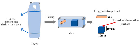 The O content of the test steel was measured using an ON-3000 oxygen and nitrogen analyzer (Ncs Testing Technology Co., Ltd., Beijing, China), the Ce content of rare earth was determined by an ion spectroscopy–mass spectrometer (ICP-MS), and the other components were detected using a Labspark1000 direct reading spectrometer (Ncs Testing Technology Co., Ltd., Beijing, China). The composition of the experimental steel is shown in Table 2; it conforms to the national standard and has certain reliability. The sampling and processing diagram of the sample is shown in Figure 2. The processed sample was polished until the surface was smooth and without scratches, and the sample was observed by a FEI-QUANTA400 scanning electron microscope (FEI, Hillsboro, OR, USA) and analyzed by its energy spectrum.