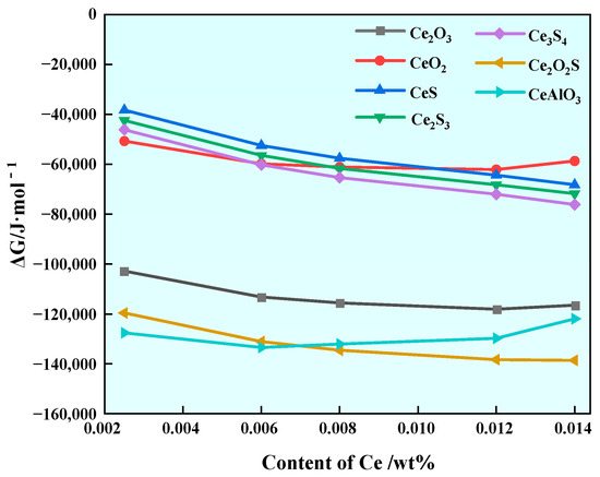 Gibbs free energy generated by Ce inclusion in steel with different Ce contents at 1600 °C.